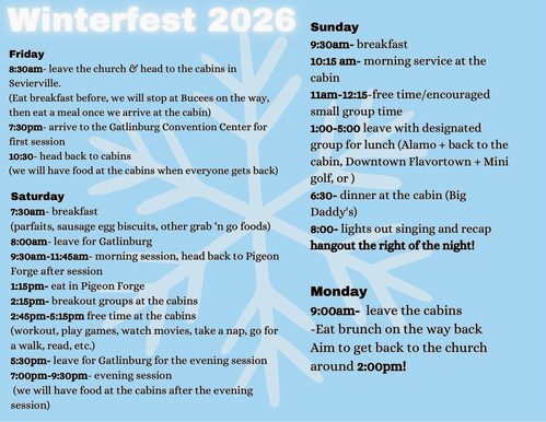 Winterfest 2026 sign up form Feb 13-16. We will be leaving the church at 8:30am in the morning on Friday February 13th. We will be staying at Hidden Mountain Resort in Sevierville, TN. The conference we will be attending Friday night & Saturday morning will be in Gatlinburg. Sunday we will spend the day in worship & fellowship together at the cabin. We will return to Wartrace Church of Christ in the afternoon on Monday February 16th. A more detailed schedule will be sent out on Facebook & to the youth.